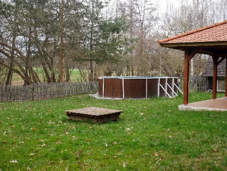 s výčepem, bazénem a prostornou pergolou s udírnou. V přilehlých zahradách najdete rybníček s možností rybaření kaprů.